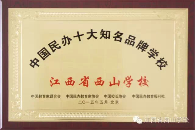 江西省西山学校秉承“一切为了师生的发展”的办学宗旨,树立“循性而育,多元发展”的办学思路,形成“以文育德,体艺结合”的办学特色,赢得了社会各界广泛的赞誉与肯定,先后被评为“中国民办十大知名品牌学校” 、“全国教育质量管理示范性学校”。